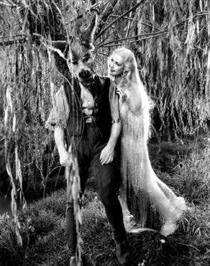 Titania (Anita Louise) seduces Bottom (James Cagney) in Max Reinhardt's 1935 film A Midsummer Night's Dream.. Reinhardt had real trees trucked in to a huge soundstage, but the lights needed for filming turned all the foilage brown, so the leaves were painted over. Photo courtesy of Dr. Macro's Movie Scans.
