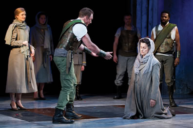 As Virgilia (Aaryn Kopp, left) and Aufidius (Reginald Andre Jackson, right) look on, Coriolanus (Patrick Page) capitulates to his begging mother, Volumnia (Diane D'Aquila) in the Shakespeare Theatre Company production of Coriolanus. Photo by Scott Suchman, Shakespeare Theatre Company.
