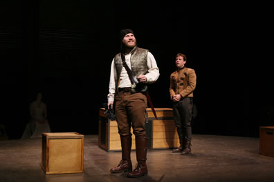 Purists may cringe at the company's textual manipulations, but, in fact, even the gimmicks are thoroughly Shakespearean; the trunk, for example, is an image Shakespeare uses in this play beyond serving as the vehicle for Iachimo's duplicity. Fiasco has made major cuts to Shakespeare's script, most significantly all of Act Five, Scene Three, in which the ghosts and Jupiter visit a sleeping Posthumus in prison. This deprives the play of its supernatural thematic strand, for good or bad, but it also allows for an energy-driven pace to the play's great plot-strands-twining climax (to me, the greater loss in cutting the vision scene is not missing the allegorical arc but a missed chance to see the Fiasco cast play out Posthumus's dream: I bet the trunk would have made a great Jupiter's eagle). Other than this scene, most other cuts and character consolidations are hardly noticeable, and the key plot elements remain intact while the play's central theme—the duality and tension between outward appearances and inner reality—is heightened. Another noteworthy alteration is Belarius reconfigured as Belaria, a woman. That's no big deal in the storytelling but is a good deal in the playing as it allows Emily Young to shine in yet another singular character when she takes on the role of surrogate mother to the lost princes.